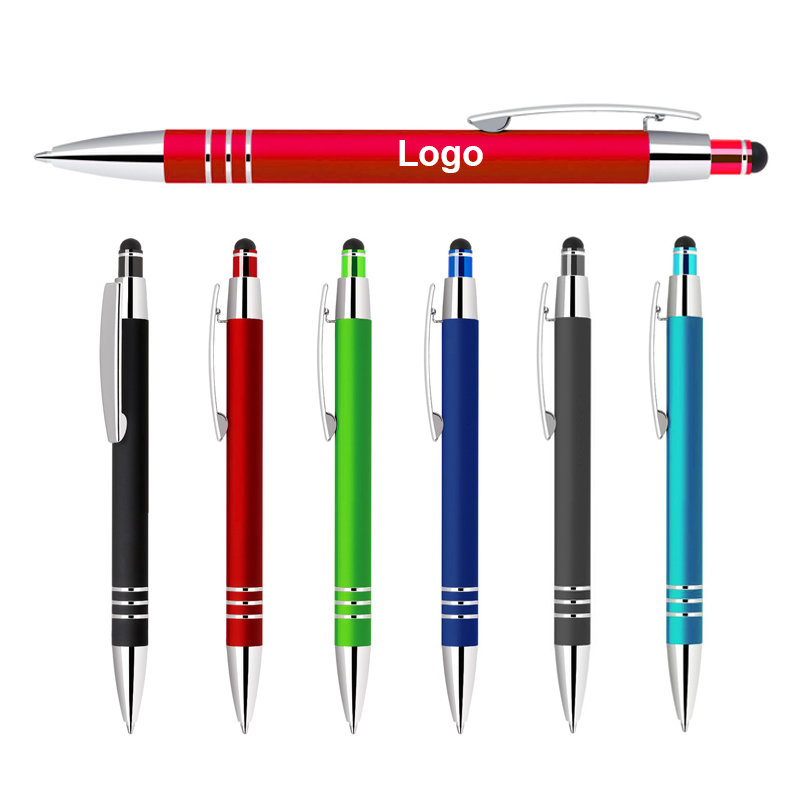 The click writing pen is made of Aluminum, featuring shiny chrome accents and black stylus tip.Works on all touchscreen devices. Great for home, office, school, an ideal event giveaway item and corporate gift. 13/32" W x 5 1/2" H ...
